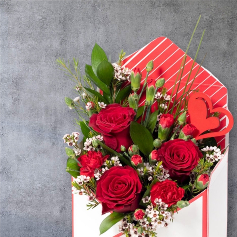 Flower arrangement arranged in oasis and designed inside a envelope living card with red roses and other complimentary flowers. Perfect to say " I love You"
