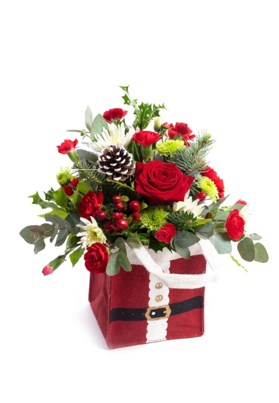 Red Christmas arrangement in a fun and festive Santa themed jute bag.