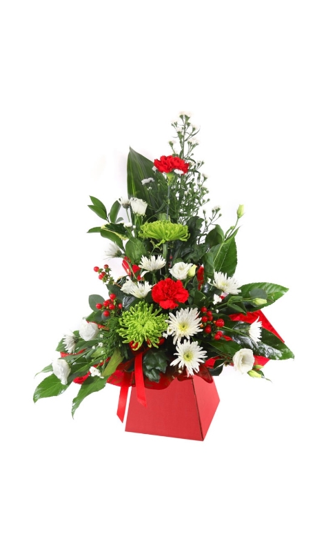 A Christmas wonderland arrangement handmade using a festive gift box and ribbons.