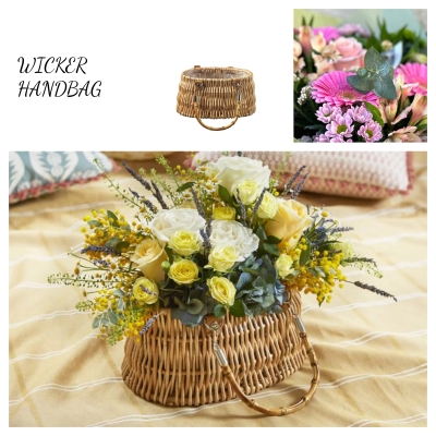 Arrangement of delicate flowers in oasis designed in a handbag style basket. In subtle tones of yellows, lemons or shades of pink. With a touch of white to compliment.