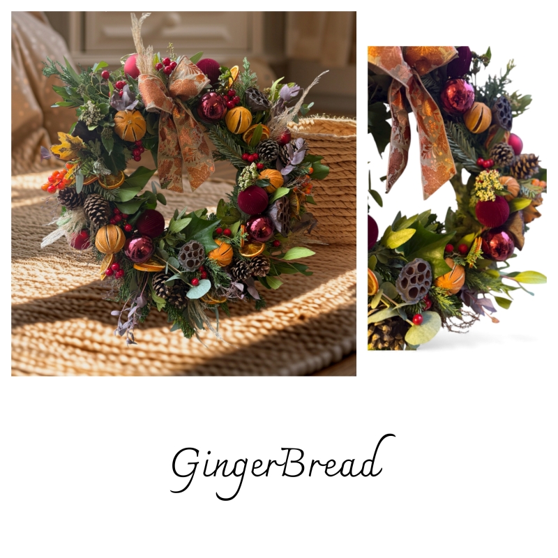 Christmas Door wreath in bright tones of reds, and oranges. with berrys fruits, cones, cinnamon sticks. and baubles.